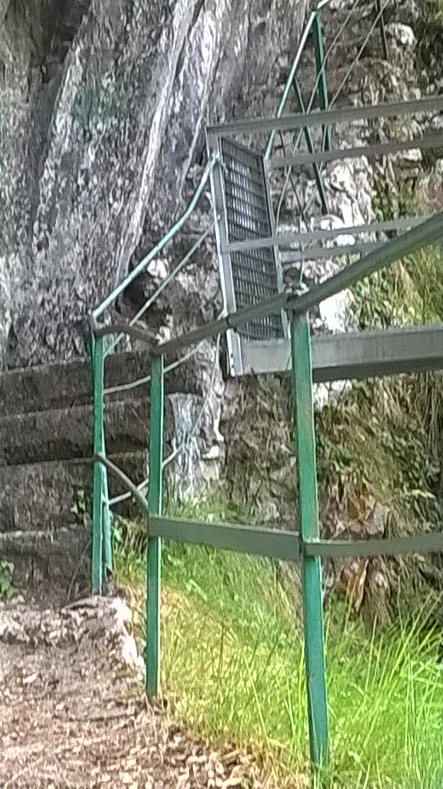 Tremendo espectáculo al salir del túnel:tubería de bajada y escalera tallada en la parte lisa de la peña.La vegetación apenas disimula la caída vertical.