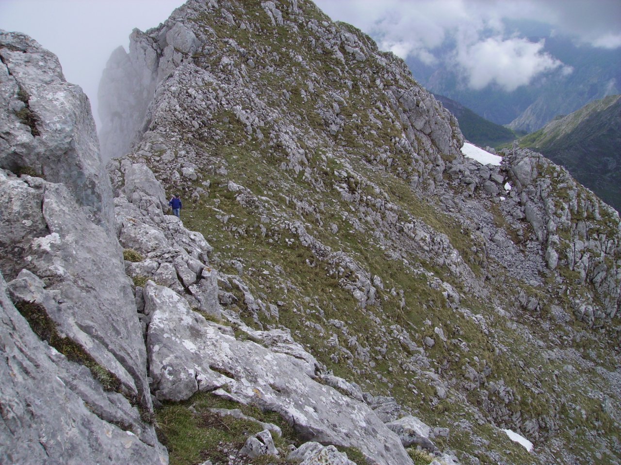 La amplia y fácil canal termina bruscamente en una cortada inpracticable;hay que girar a la izquierda: para ello hay dos pasos: uno, junto a la propia cortada,ancho pero algo expuesto y otro el que se ve en primer término más fácil pero muy estrecho.